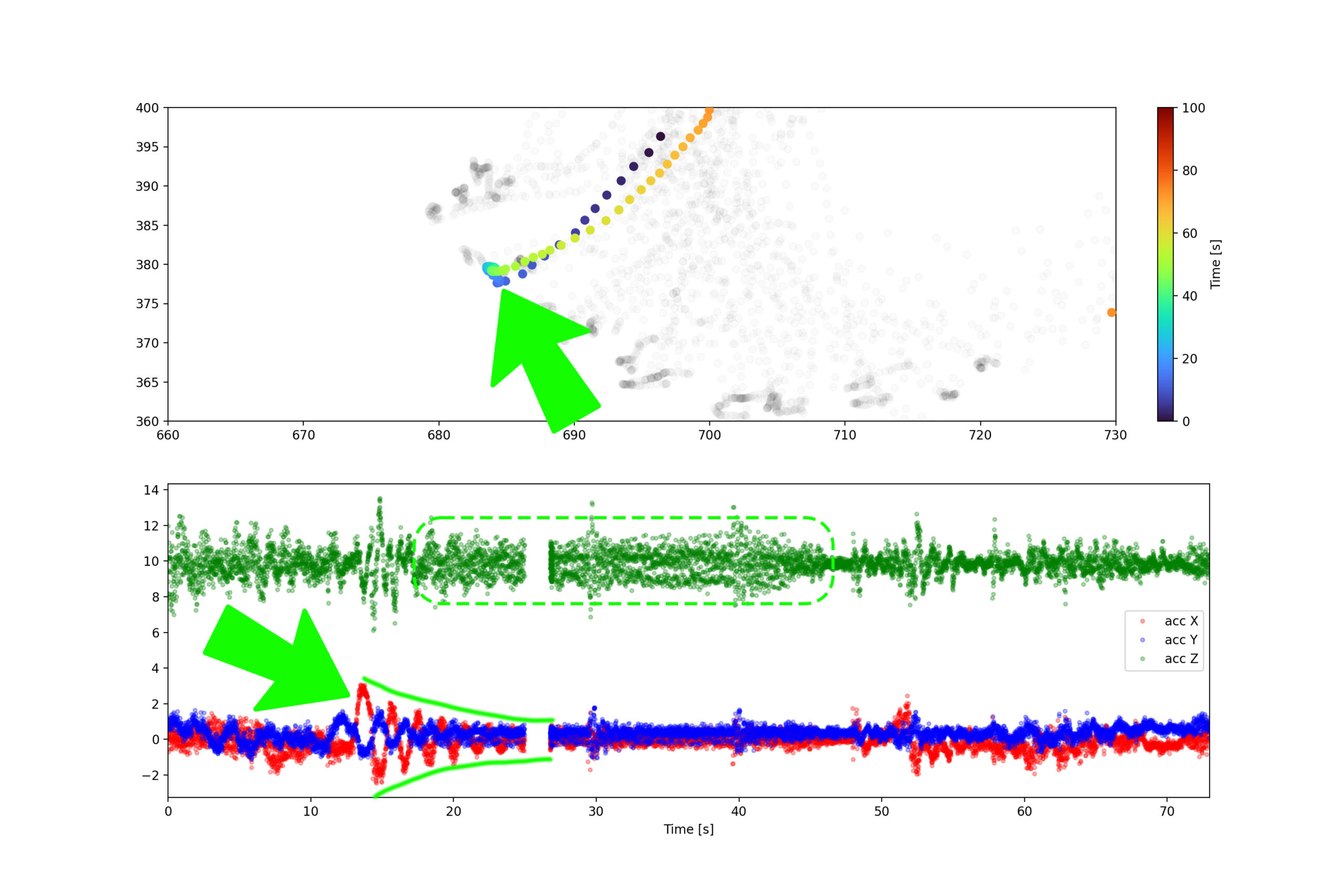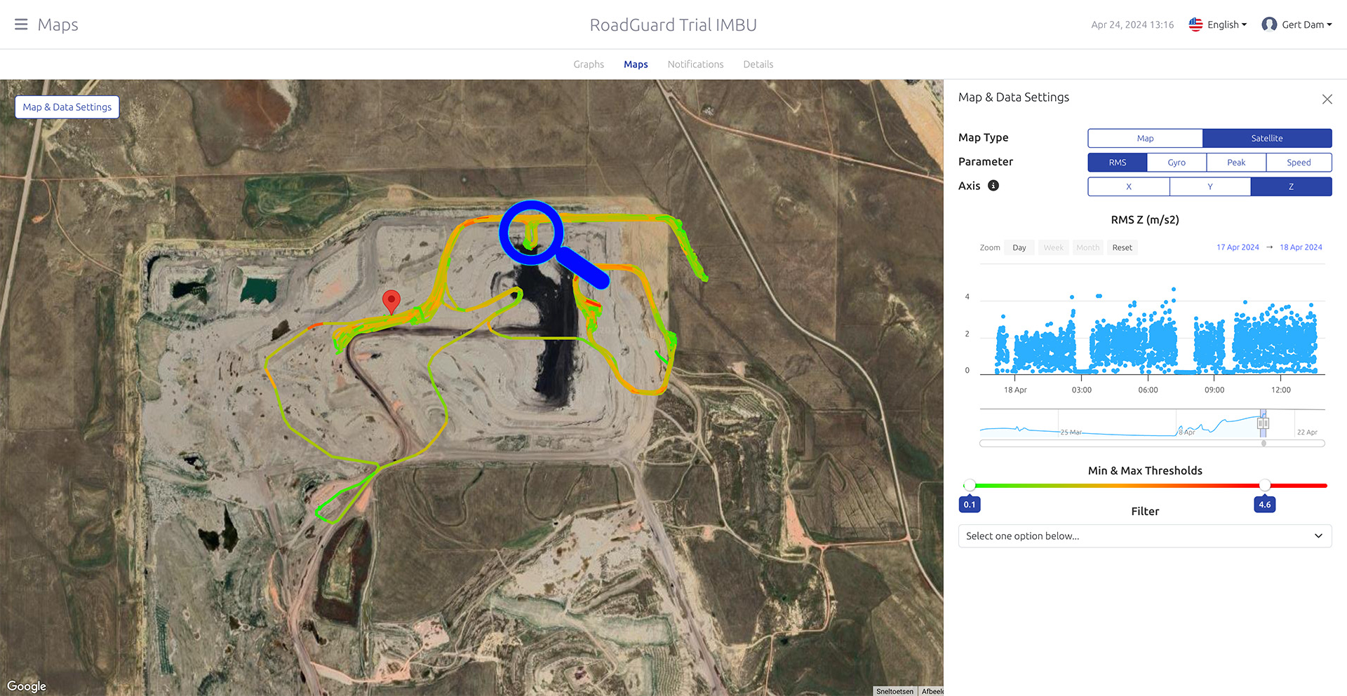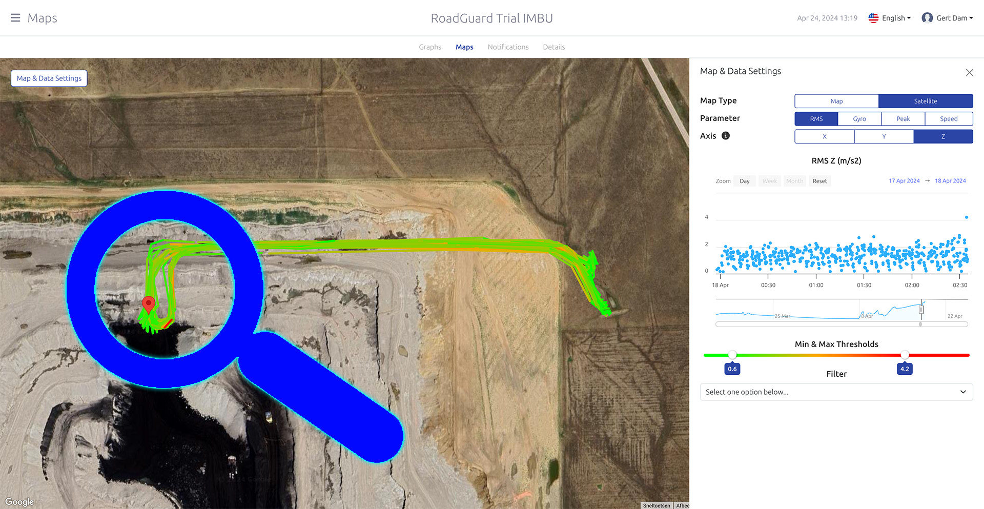 By defining a GPS search window centered around the location where haul trucks dump their load, we honed in on crucial moments within the unloading process. What emerged from this analysis were two distinct features evident in the waveform data. Firstly, a discernible waveform in the horizontal plane signaled the precise moment when the truck’s wheels made contact with the brim—a critical reference point for the unloading operation. Subsequently, a higher frequency vibration emerged in the vertical direction, directly attributed to the movement of the load as it exited the bucket. This consistent pattern, observed across numerous unloading events captured by RoadGuard, underscored the potential for precise and reliable event detection, offering invaluable insights into operational efficiency and safety within the mine.